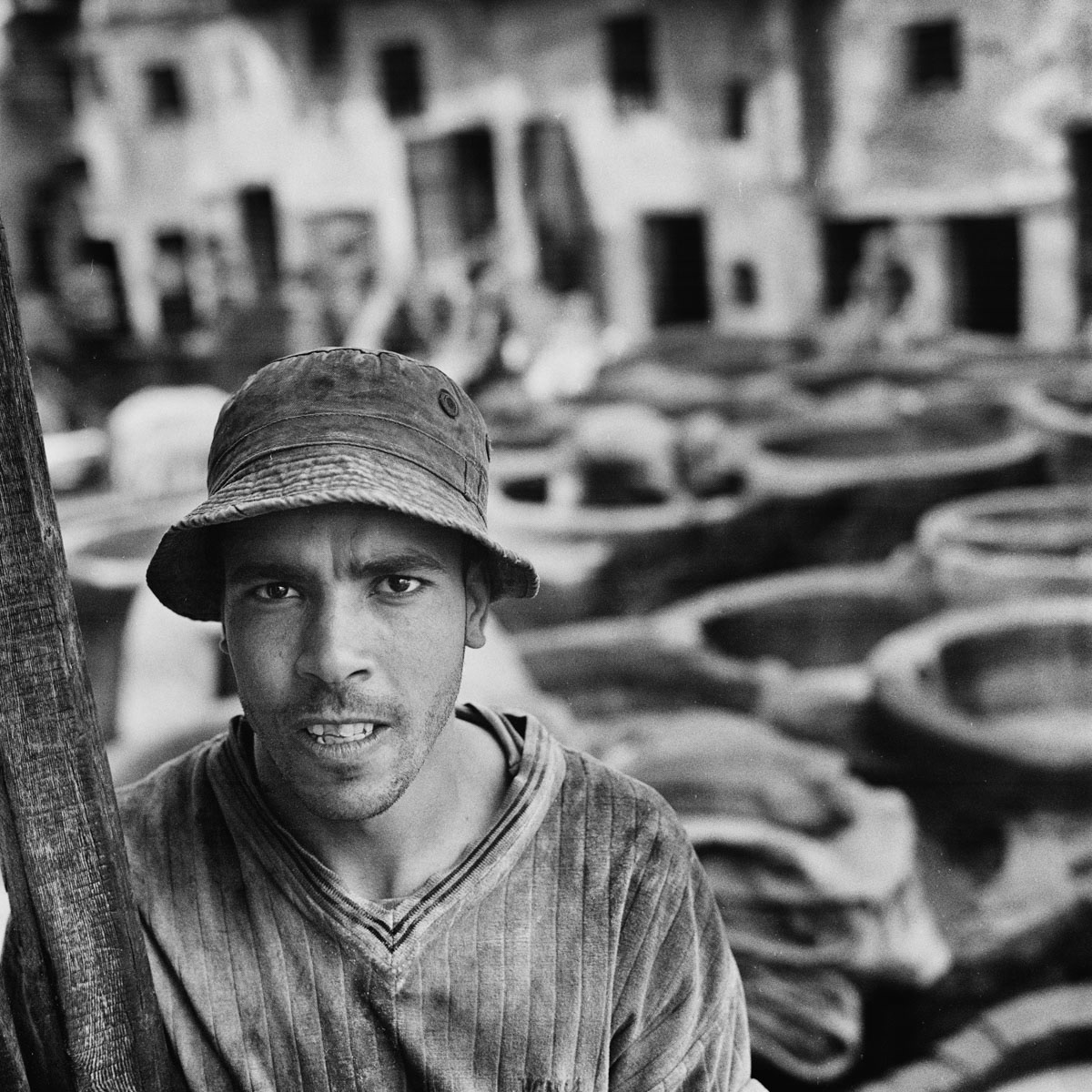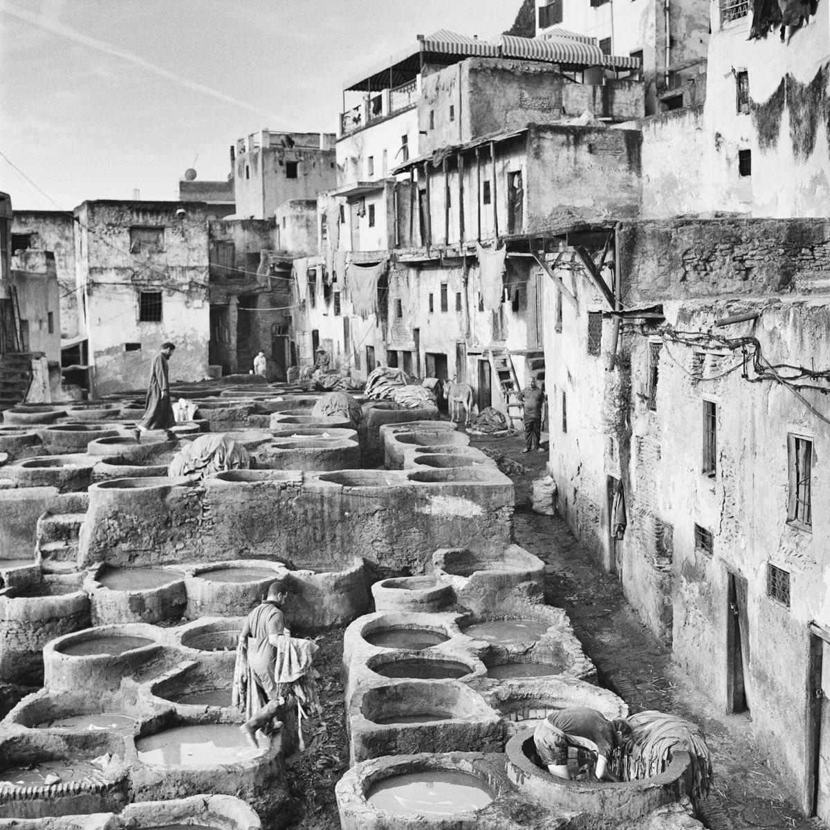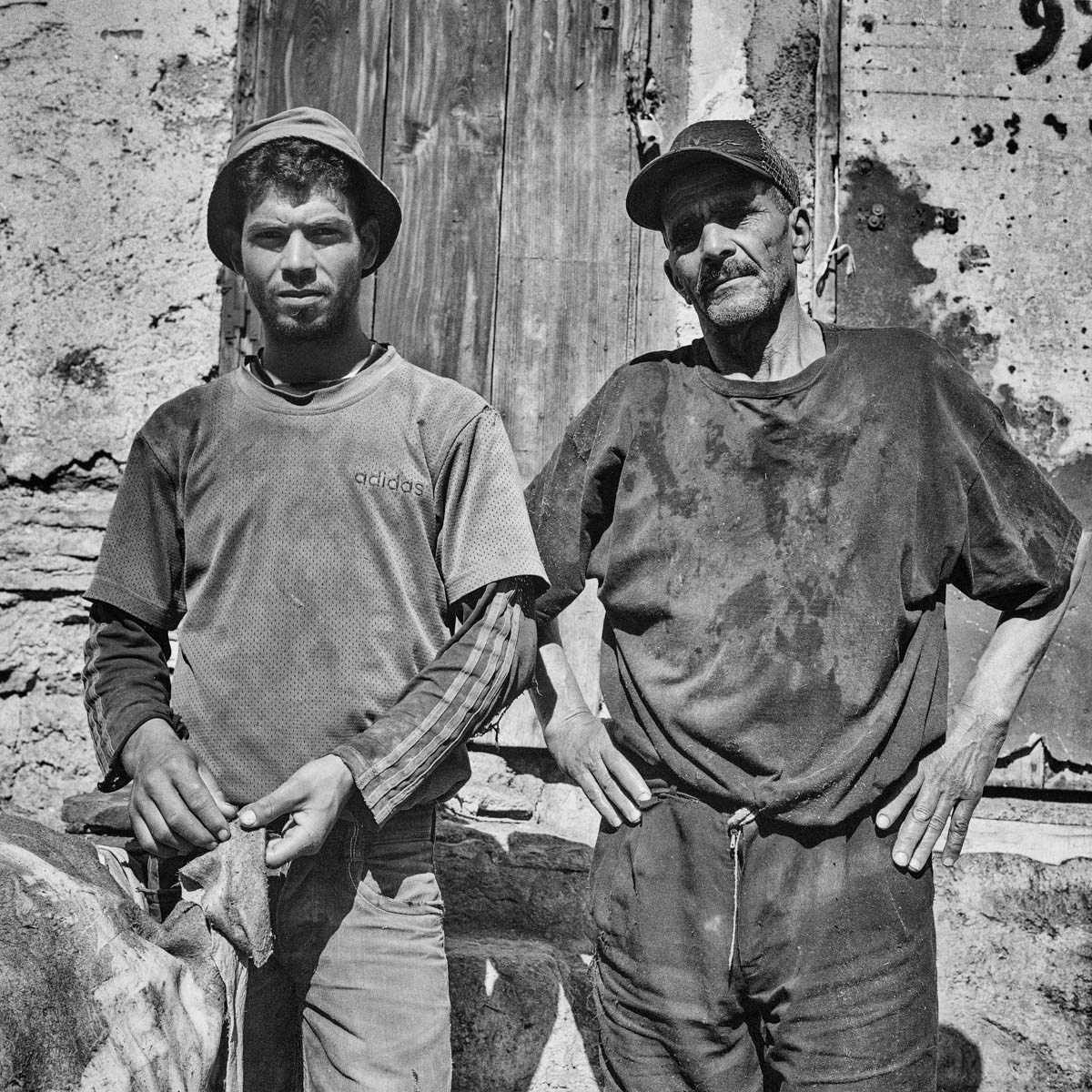 Les touristes, attirés par les vendeurs de maroquinerie, les regardent du haut des terrasses, une feuille de menthe sous le nez pour masquer la forte odeur du lieu. Eux, ce sont les tanneurs de Fès. Une des grandes fiertés de la plus ancienne médina au monde. Travaillant toutes l’année dans des conditions qui ont peu changé depuis douze siècles pour un salaire en dessous du smic marocain, ils continuent inlassablement, jour après jour, les même gestes qu'ont fait leurs ancêtres avant eux. Mettons-nous à leur niveau, les yeux dans les yeux.